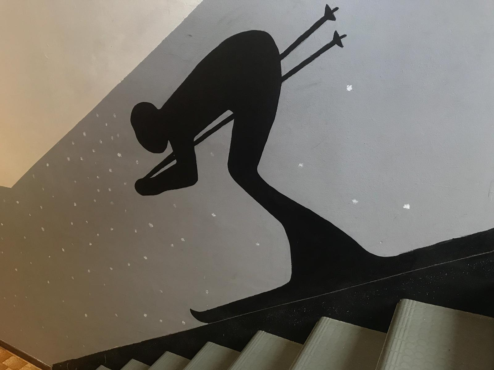 La seconda domanda è stata -” A cosa state lavorando?”-“Stiamo lavorando ad alcuni murales, pensati e progettati dai ragazzi e adesso realizzati con delle tematiche. Alcune sono state indicate da me, come la scritta “arte” sulla parete dell’aula di arte. Le altre tematiche sono emerse dal lavoro in team. La tematica della neve, degli scii lungo le scale è cominciata nel 1° quadrimestre sta continuando adesso con un altro gruppo, invece la tematica del mondo fantastico che può nascere fuori dalla lettura di un bel libro che è stata cominciata anche questa nel 1° quadrimestre”.