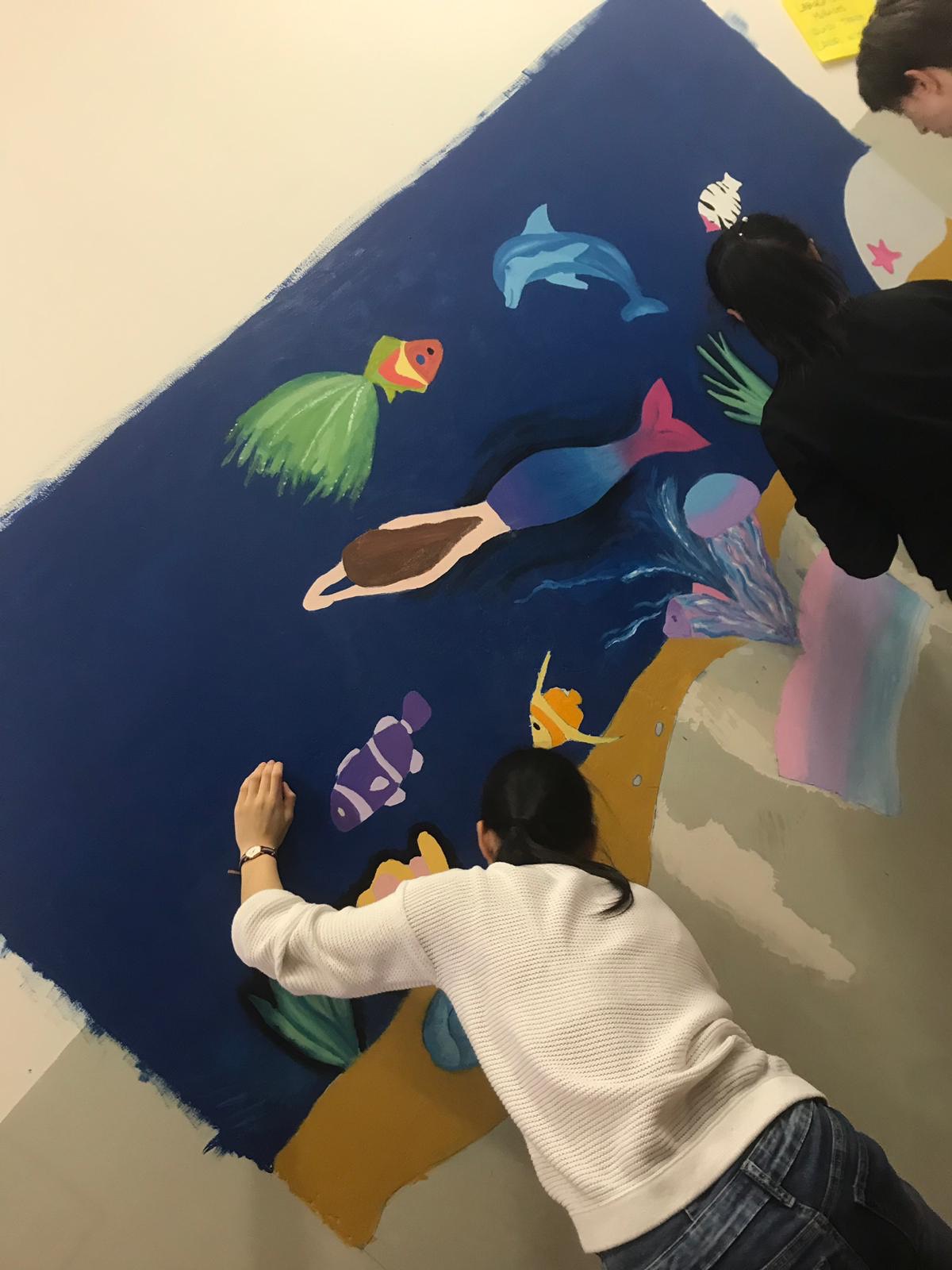 La seconda domanda è stata -” A cosa state lavorando?”-“Stiamo lavorando ad alcuni murales, pensati e progettati dai ragazzi e adesso realizzati con delle tematiche. Alcune sono state indicate da me, come la scritta “arte” sulla parete dell’aula di arte. Le altre tematiche sono emerse dal lavoro in team. La tematica della neve, degli scii lungo le scale è cominciata nel 1° quadrimestre sta continuando adesso con un altro gruppo, invece la tematica del mondo fantastico che può nascere fuori dalla lettura di un bel libro che è stata cominciata anche questa nel 1° quadrimestre”.